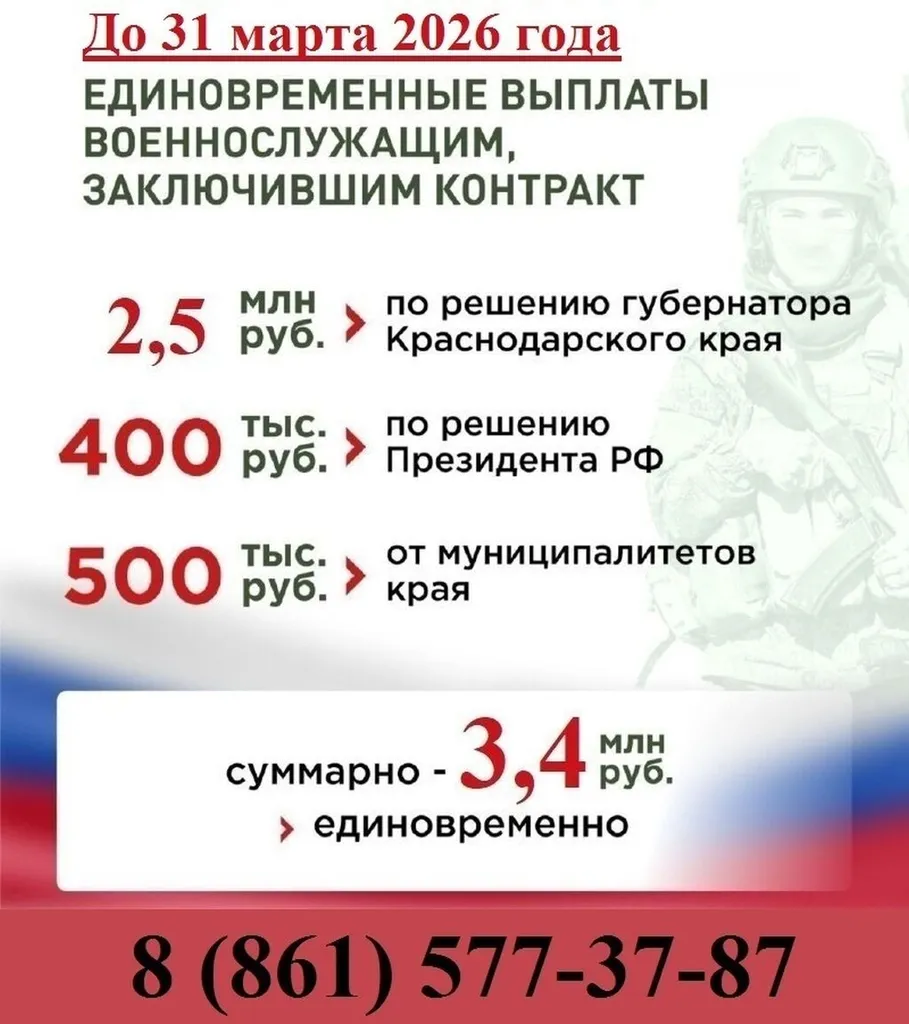 В Краснодарском крае при заключении контракта на прохождение службы единовременно выплачивают 3,4 миллиона рублей в 2026 году