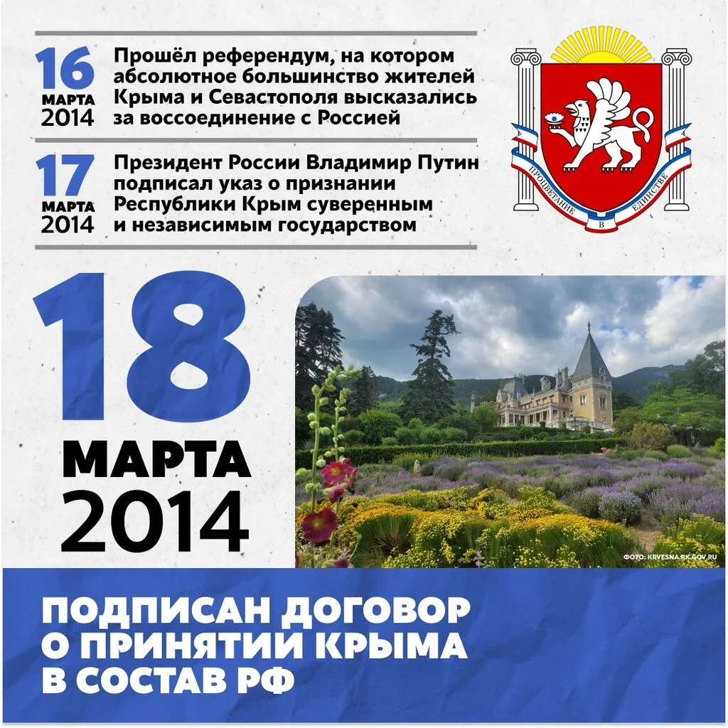 День воссоединения Крыма с Россией — важная историческая дата, которая отмечается ежегодно 18 марта начиная с 2014 года, когда Республика Крым и город-герой Севастополь официально вошли в состав Российской Федерации.